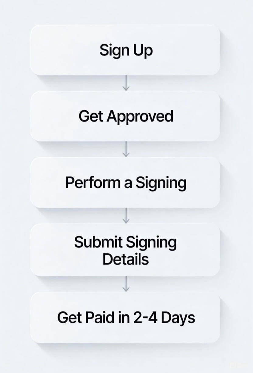 We make getting paid as a notary simple and fast.Independent notaries sign up once, submit job confirmations easily, and choose unlimited 2-4 day ACH payouts with our affordable monthly subscriptions—or pay per signing.No more net-30+ waits: focus on your signings while we handle secure, automated payments.