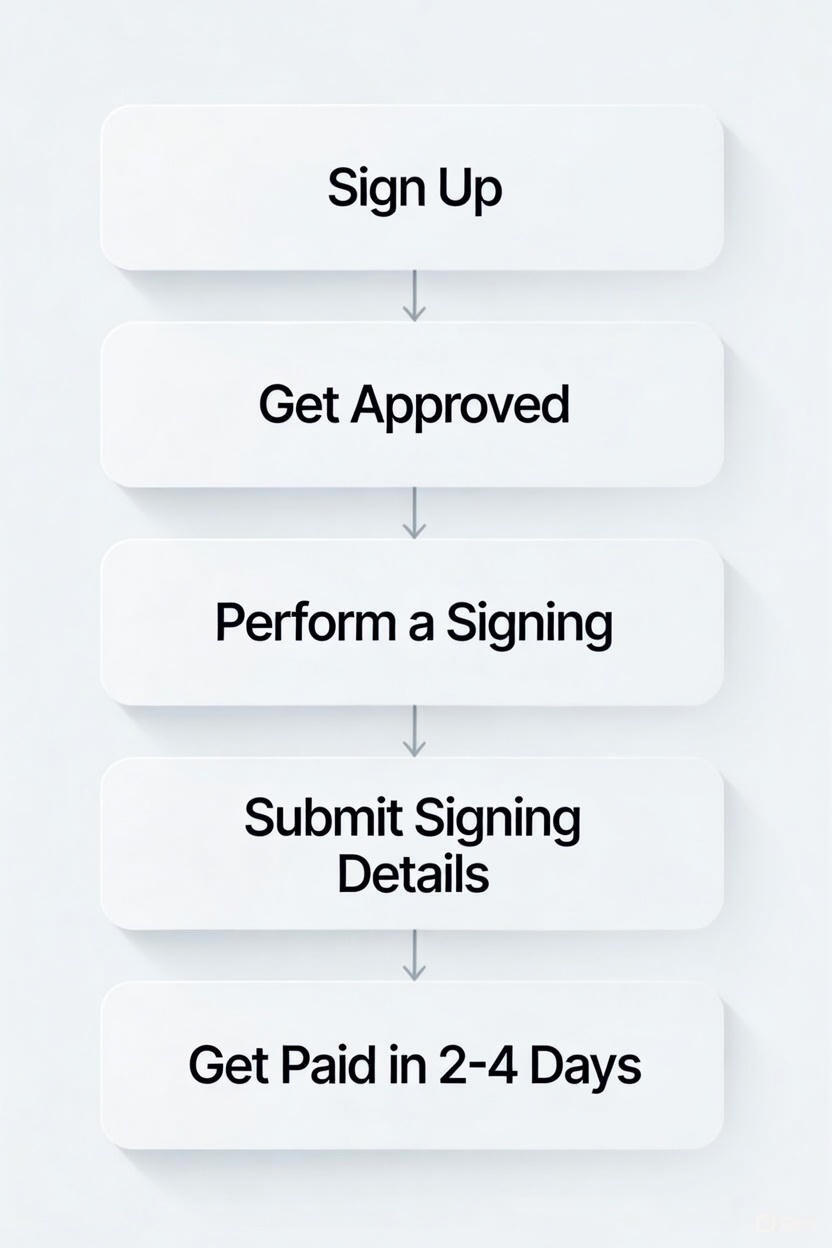 We make getting paid as a notary simple and fast.Independent notaries sign up once, submit job confirmations easily, and choose unlimited 2-4 day ACH payouts with our affordable monthly subscriptions—or pay per signing.No more net-30+ waits: focus on your signings while we handle secure, automated payments.